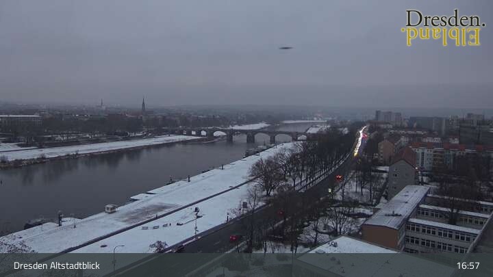 Die Kamera befindet sich am Hotel am Terrassenufer in Dresden und blickt auf die Altstadt und die Elbe.
