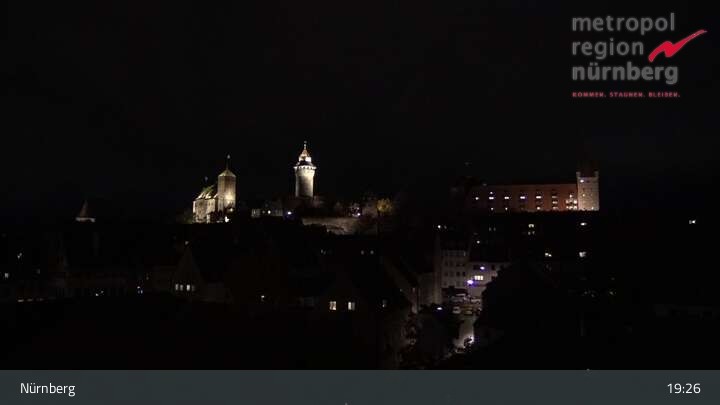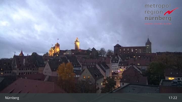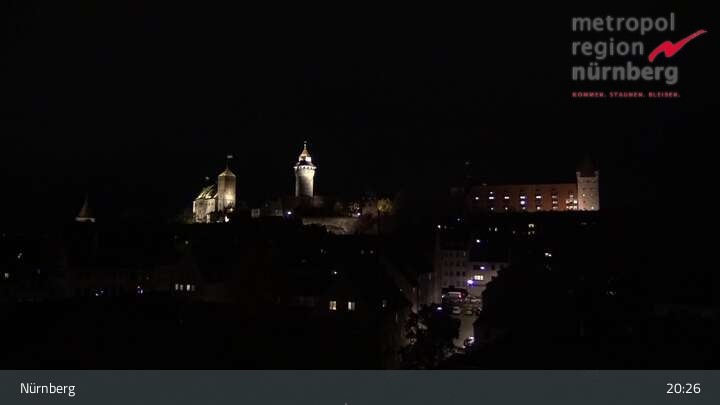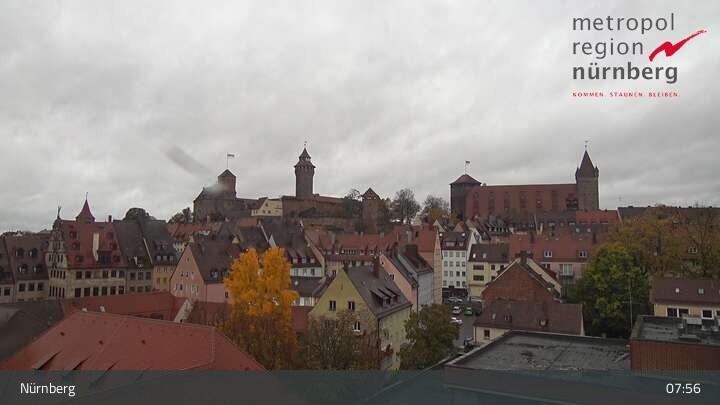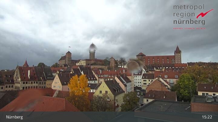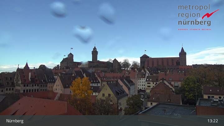 Blick über die Dächer Nürnbergs, die zweitgrößte Stadt Bayerns. Die Kamera ist in der Theresienstraße in der Altstadt positioniert und zeigt unter anderem die Kaiserburg, das Rathaus und das Staatstheater.