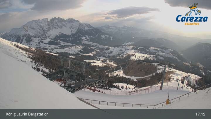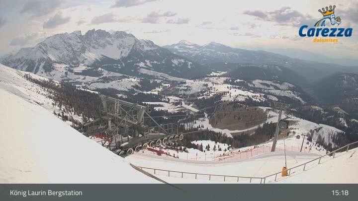 Die Webcam eröffnet von der Kölner Hütte das Panorama zum Latemar. Du siehst hier auch gut die neue König Laurin Gondelbahn mit unterirdischer Bergstation.