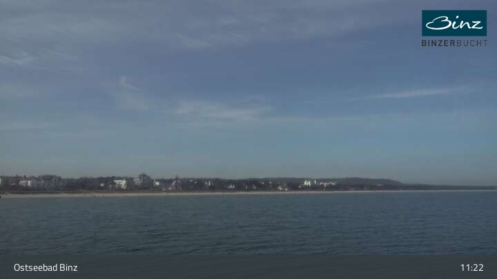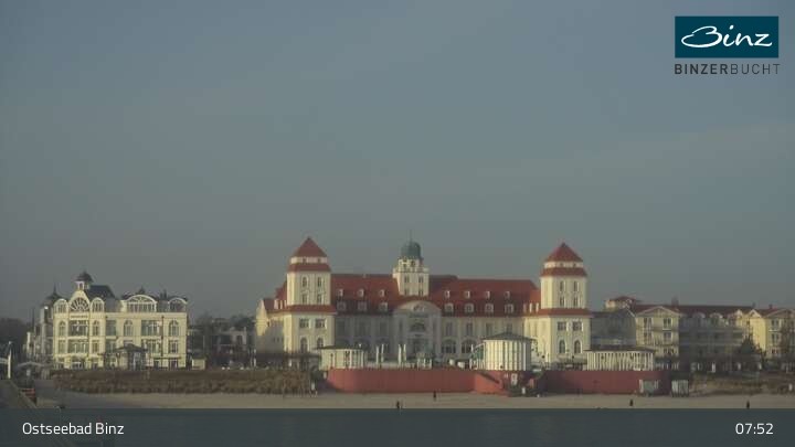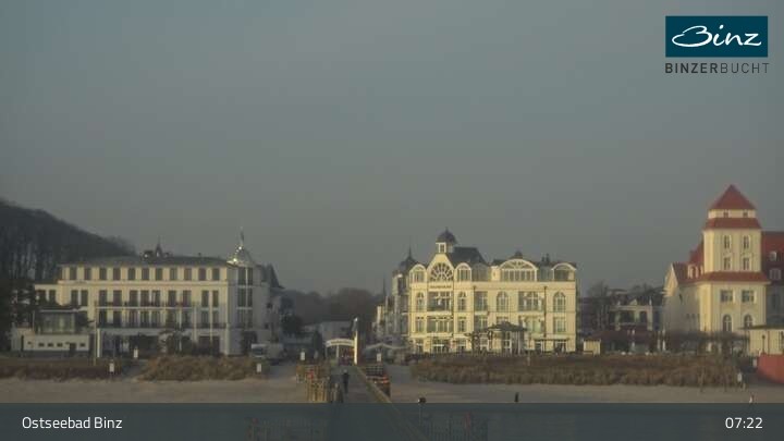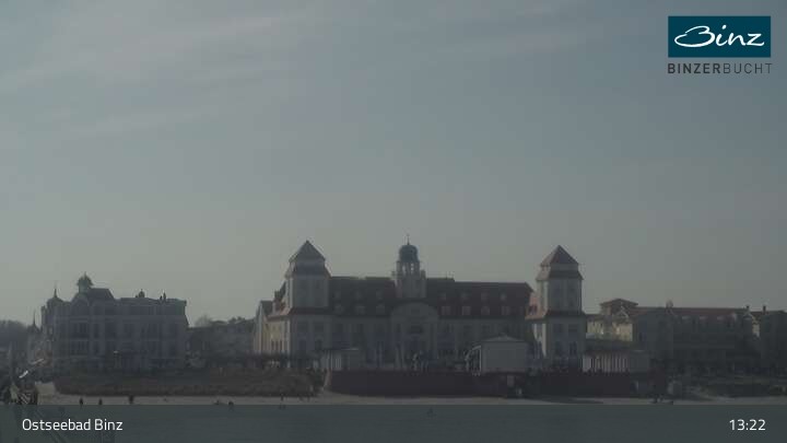 Zu sehen ist die Strandpromenade des Ostseebades Binz. Die Webcam ist auf der Seebrücke Binz positioniert und zeigt unter anderem Kurhaus, Strandpromenade und den Fischerstrand.