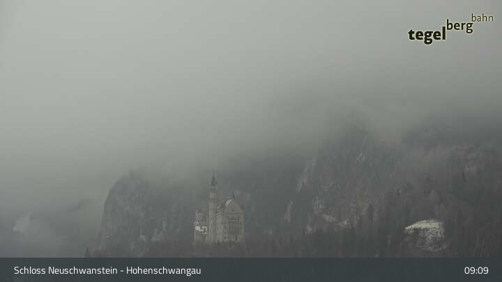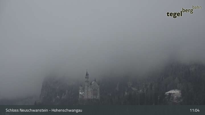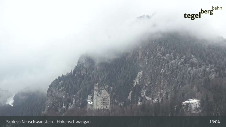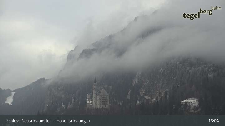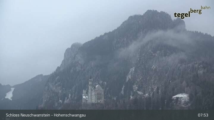 Die Kamera befindet sich am Schloss Hohenschwangau und schwenkt vom Schloss Neuschwanstein zum Museum der Bayerischen Könige.