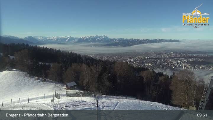 Die Video-Webcam zeigt einen traumhaften Panoramablick von der Bergstation am Pfänder hinunter auf den Bodensee und die Stadt Bregenz.