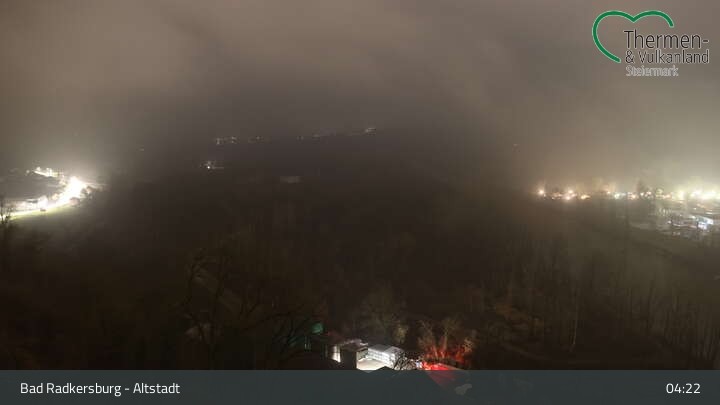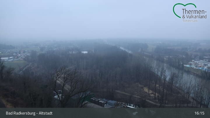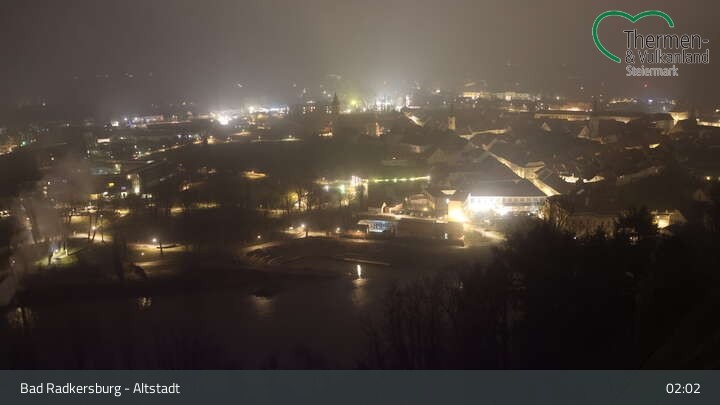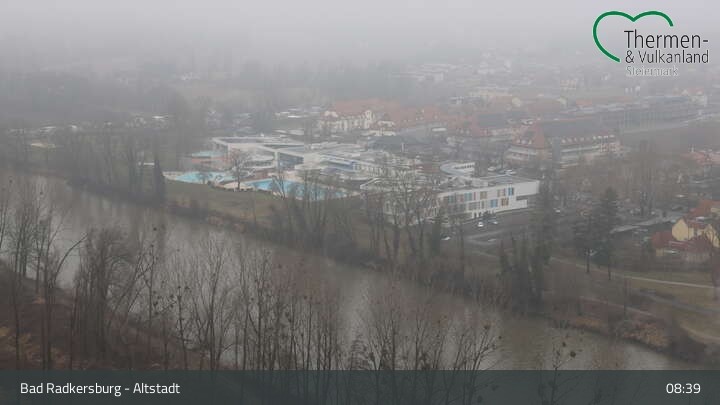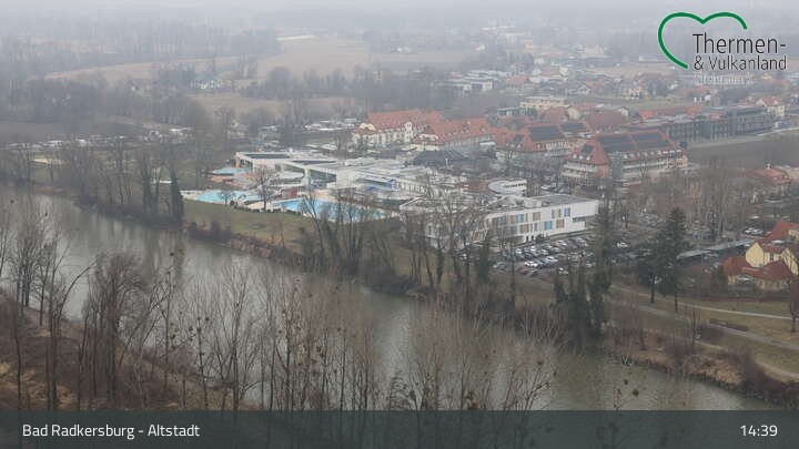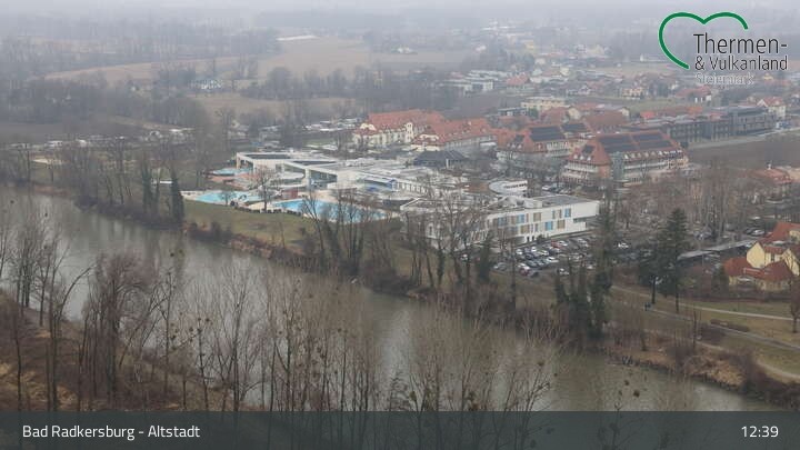 Hier blickst du auf die historische Altstadt von Bad Radkersburg. Du kannst die Stadtpfarrkirche und die Frauenkirche erkennen. Davor befindet sich die Mur, die die Grenze zu Slowenien bildet.