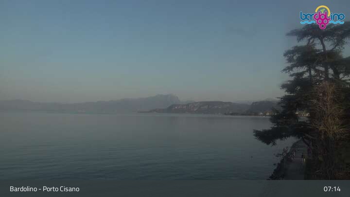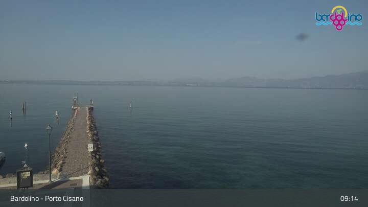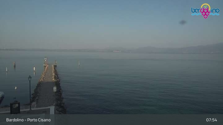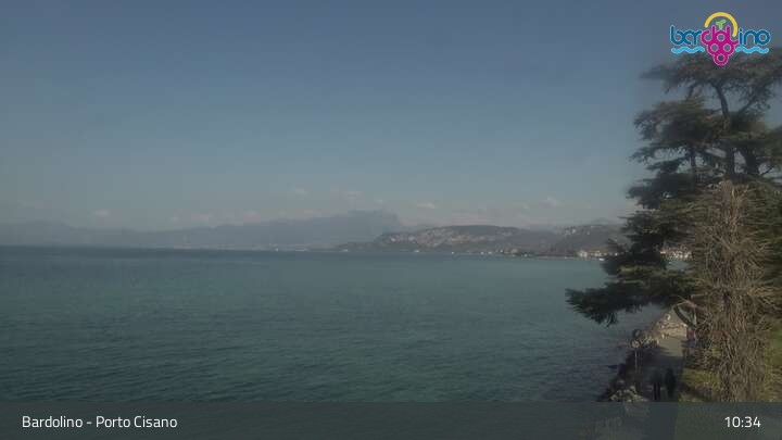 Die Kamera befindet sich am Strand Lido Mirabello und blickt nach Norden auf den Hafen von Bardolino am Gardasee.