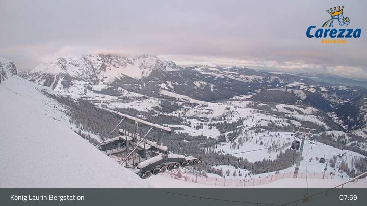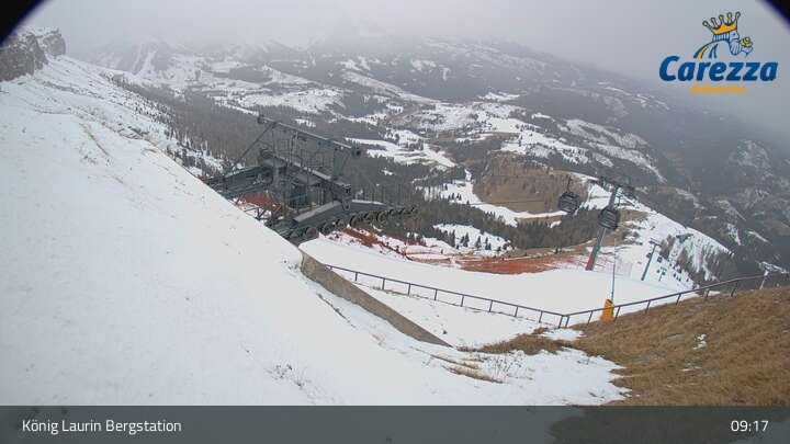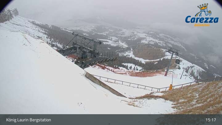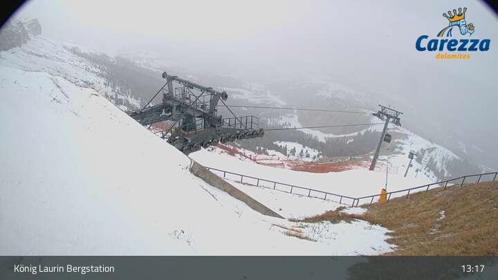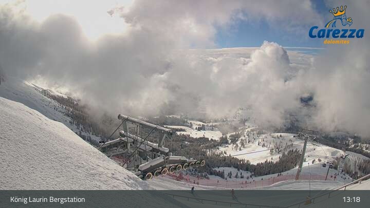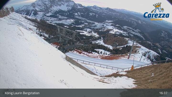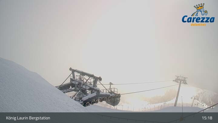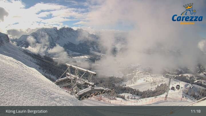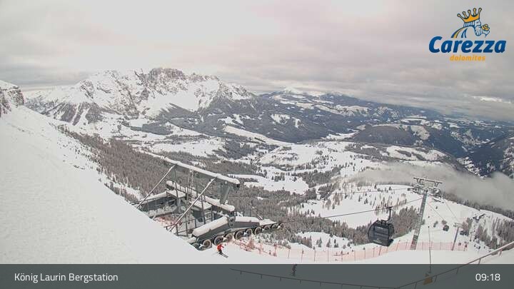 Die Webcam eröffnet von der Kölner Hütte das Panorama zum Latemar. Du siehst hier auch gut die neue König Laurin Gondelbahn mit unterirdischer Bergstation.