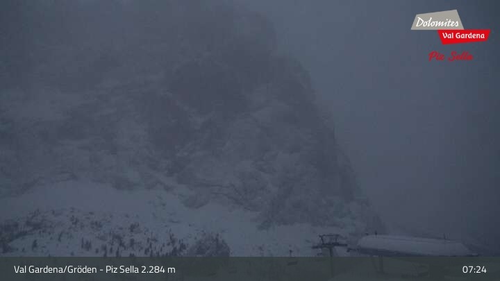 Ausblick von der Bergstation am Piz Sella in Val Gardena in Südirol. Zu sehen sind u.a. der Langkofel und die Sellagrupee.
