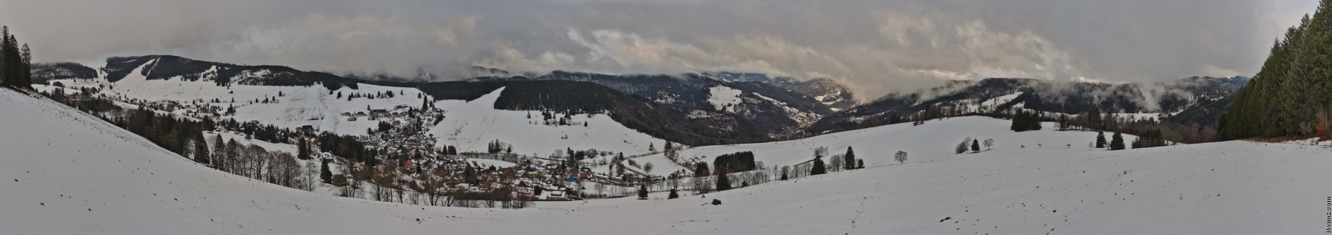 Ausblick auf das Dorf Todtnauberg im Schwarzwald. Gut zu erkennen sind auch auf der Panoramaaufnahme auch die Berge in der Umgebung, unter anderem Stübenwasen, Feldberg, Hasenhorn und Gisiboden.