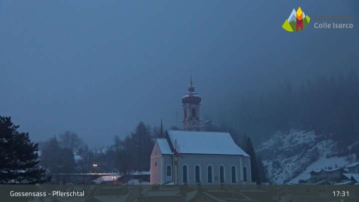 Die Kamera zeigt die Kirche Parrocchia San Valentino in Gossensass im Eisacktal.