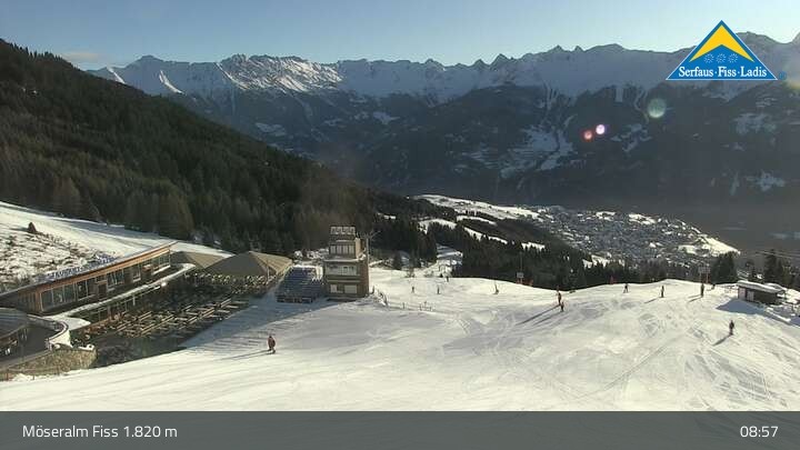 Genieße die Aussicht vom Bergrestaurant Möseralm, das sich oberhalb von Fiss befindet. Dort findest du auch einen großen Sommer Funpark.