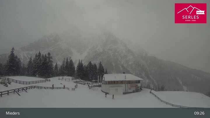 Die Webcam eröffnet den Blick von der Bergstation Koppeneck auf den Hausberg von Mieders, die Serles. Zu sehen sind außerdem das Bergrestaurant Koppeneck mit Kinderspielplatz und der Speichersee.