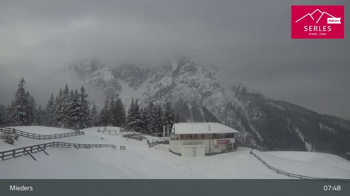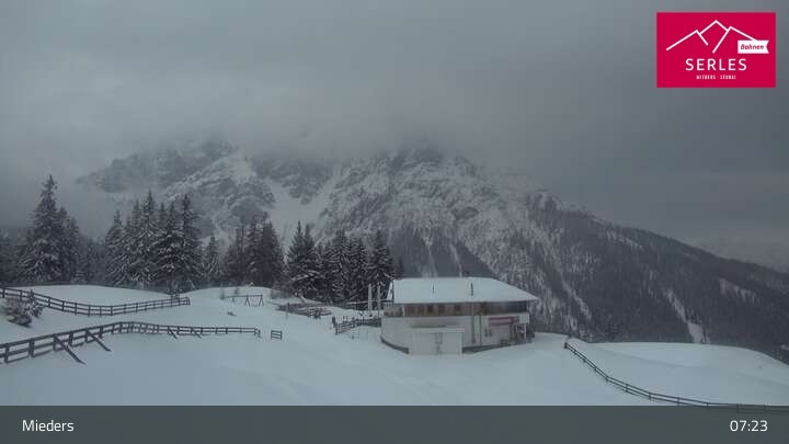 Die Webcam eröffnet den Blick von der Bergstation Koppeneck auf den Hausberg von Mieders, die Serles. Zu sehen sind außerdem das Bergrestaurant Koppeneck mit Kinderspielplatz und der Speichersee.