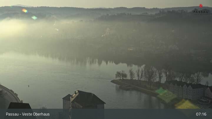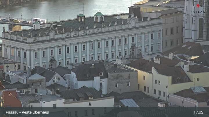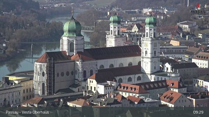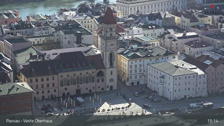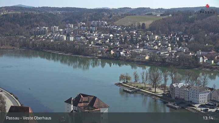 Die Webcam zeigt dir den Blick von der Veste Oberhaus über die Donau zur Altstadt der niederbayerischen Stadt Passau. Sehr gut zu erkennen sind links Teile der Burgveste, die Ortspitze wo die drei Flüsse Donau, Inn und Ilz zusammenfließen, die Hängebrücke über die Donau und rechts der weiße Stephansdom.