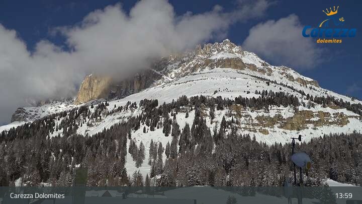 Hier siehst du die Talstation des Sessellifts Pra di Tori sowie die Berge von Carezza