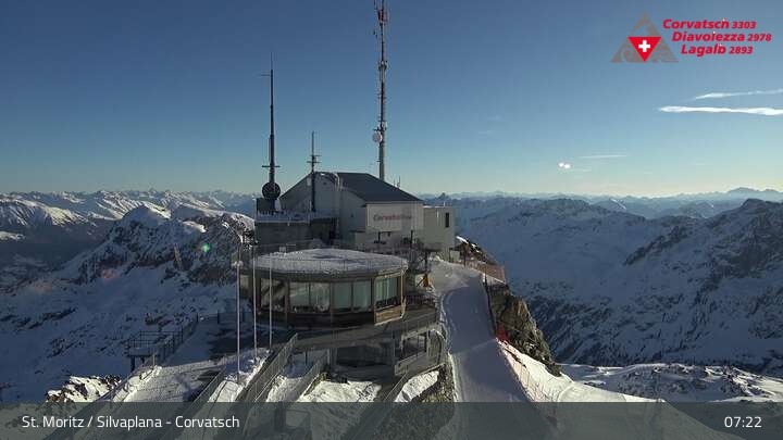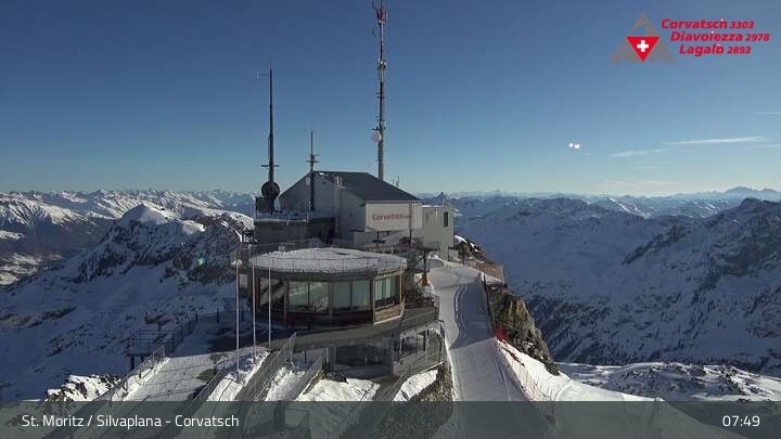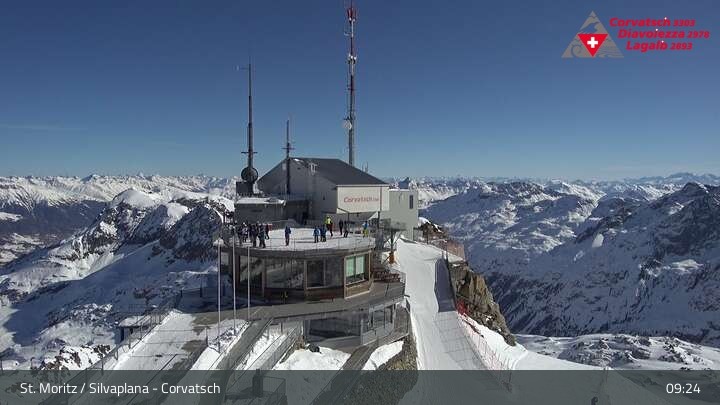 Die Webcam zeigt einen tollen Panoramablick von der Bergstation der Seilbahn am Corvatsch auf den Silvaplanersee.