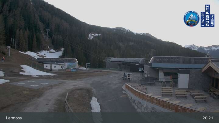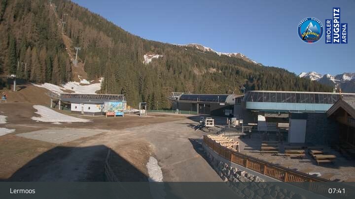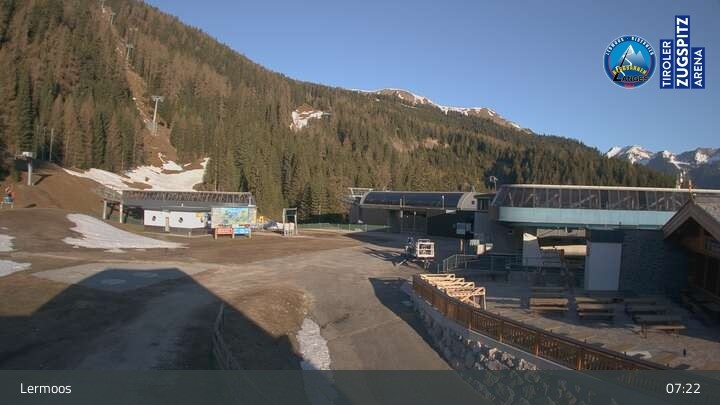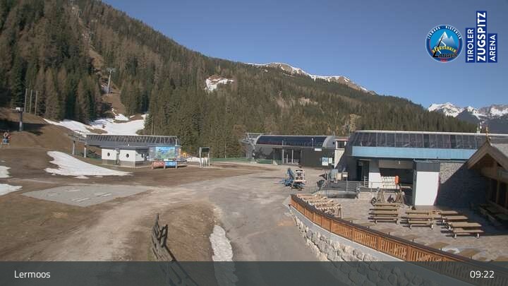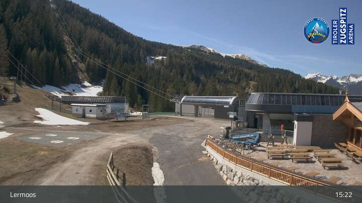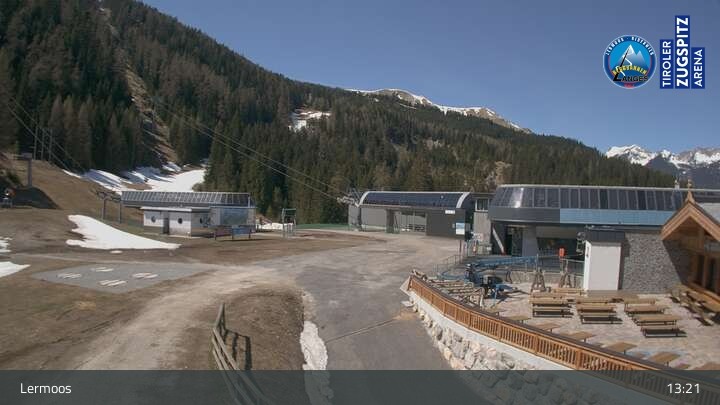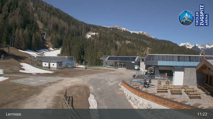 Die Webcam befindet sich an der Bergstation des Hochmoos Express in Lermoos und blickt auf die umliegenden Alpen.