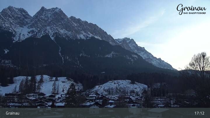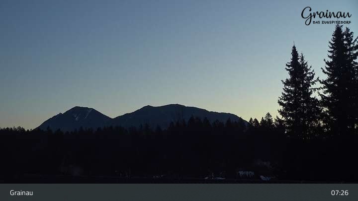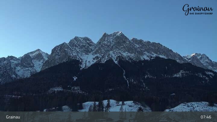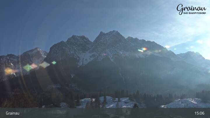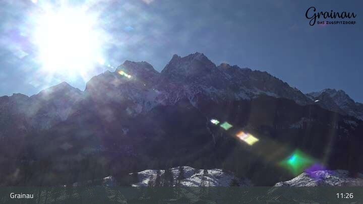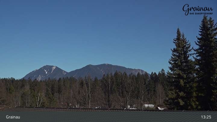 Die Live-Webcam zeigt vom Freibad aus einen Rundumblick auf das Bergdorf Grainau und seine Umgebung. Zu sehen sind unter anderem die Zugspitze, der große und kleine Waxenstein sowie der Hohe Ziegspitz.