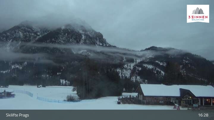 Zu sehen sind die Skilifte Prags in der Dolomitenregion Drei Zinnen. Im Hintergrund ist auch der markante Dürrenstein zu erkennen.