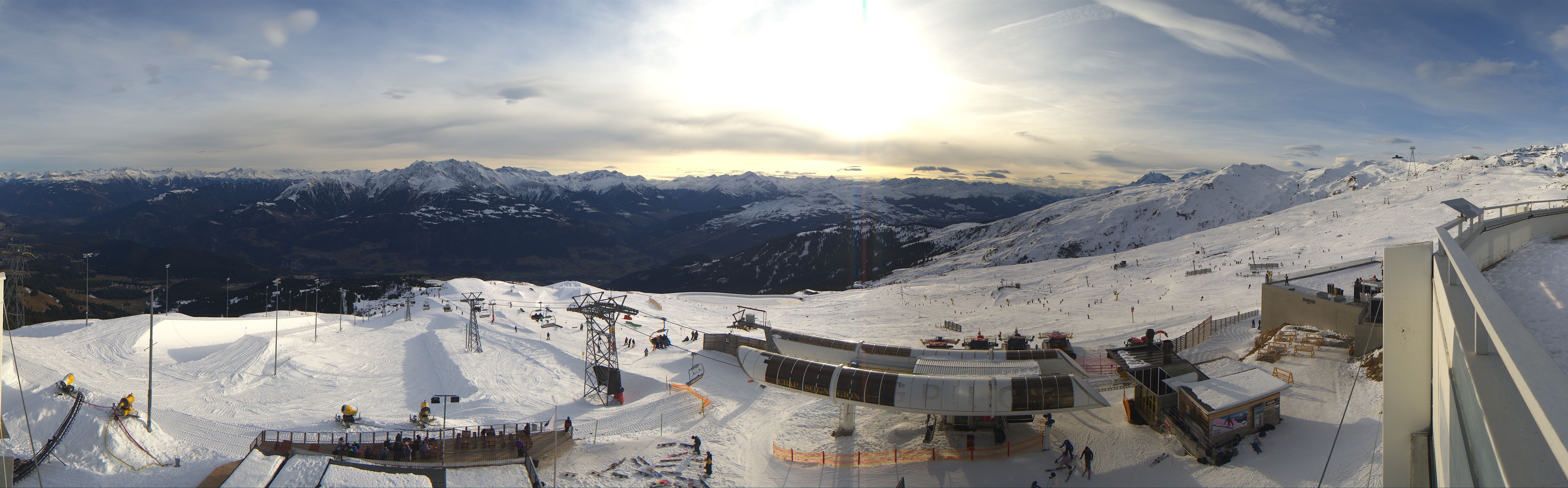 Die Roundshot-Cam befindet sich an der Bergstation des Curnius Sessellifts im Schweizer Skigebiet Laax und bietet einen fantastischen 360-Grad-Blick auf das Skigebiet mit dem Snowpark am Crap Sogn Gion.
