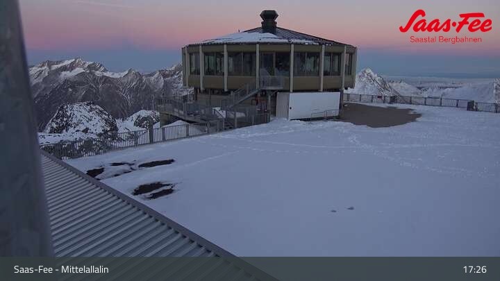 Diese Webcam auf dem Mittelallalin, einem Nebengipfel des Allalinhorns in Saas-Fee zeigt das Drehrestaurant, von dem aus man die Aussicht auf die umliegenden Walliser Alpen genießen kann.