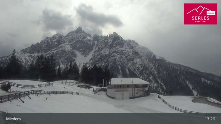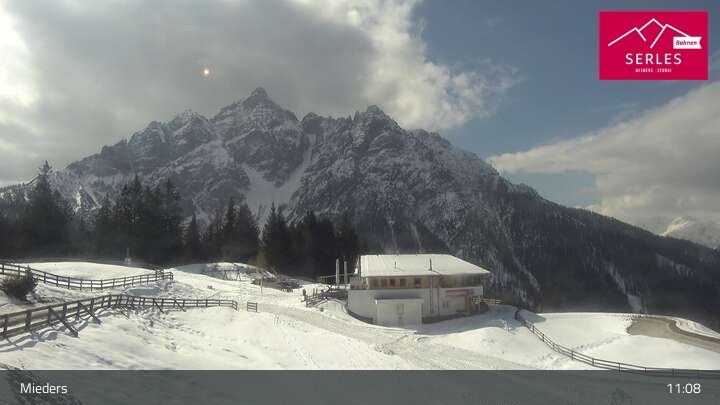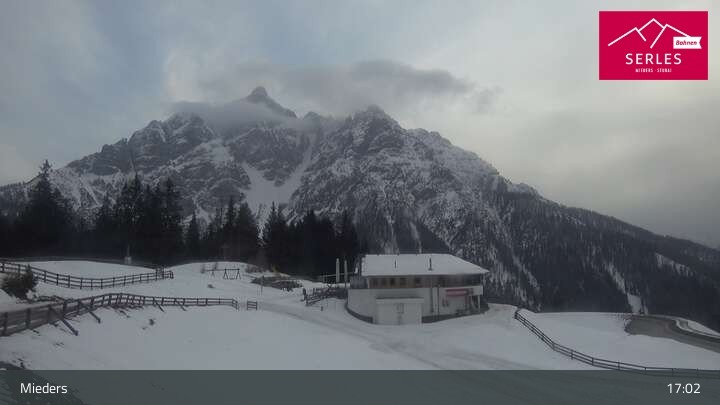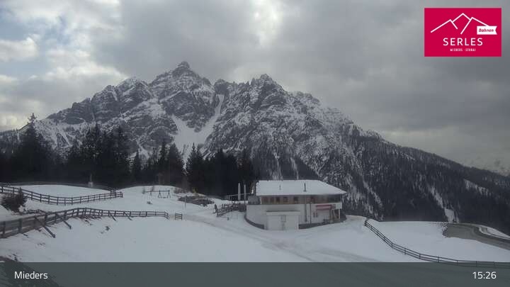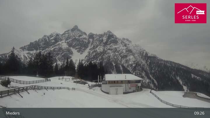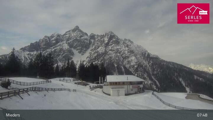 Die Webcam eröffnet den Blick von der Bergstation Koppeneck auf den Hausberg von Mieders, die Serles. Zu sehen sind außerdem das Bergrestaurant Koppeneck mit Kinderspielplatz und der Speichersee.