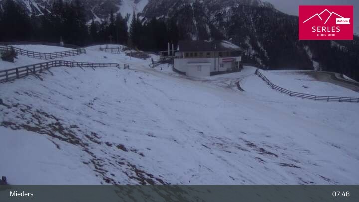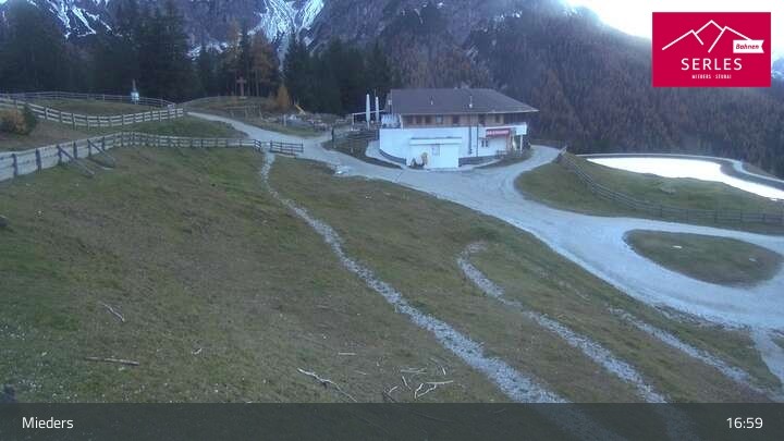 Die Webcam eröffnet den Blick von der Bergstation Koppeneck auf den Hausberg von Mieders, die Serles. Zu sehen sind außerdem das Bergrestaurant Koppeneck mit Kinderspielplatz und der Speichersee.