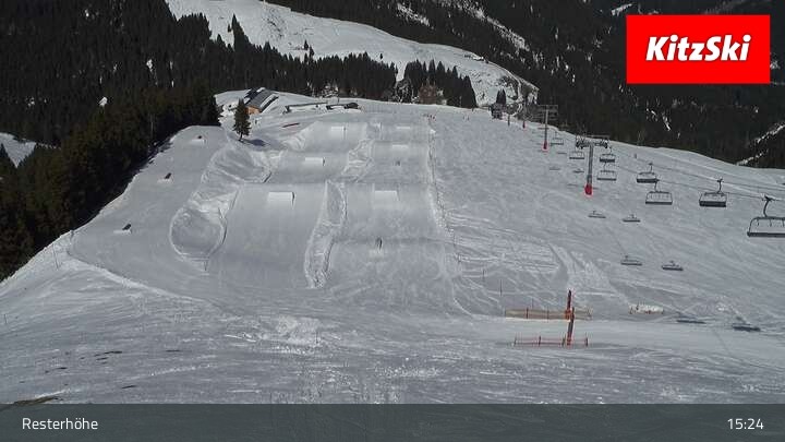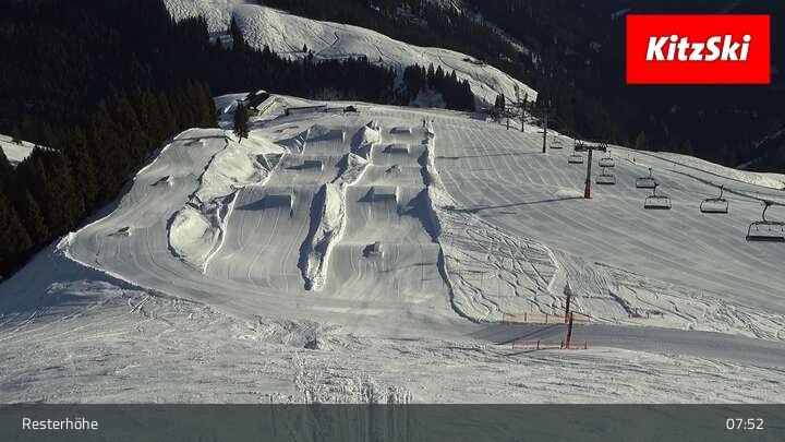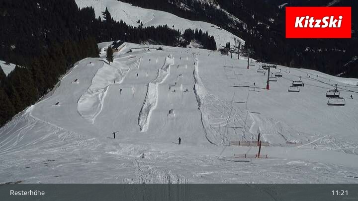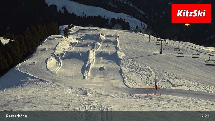 Hier blickst du von der Hangalm auf den Snowpark des Skigebiets Kitzbühel