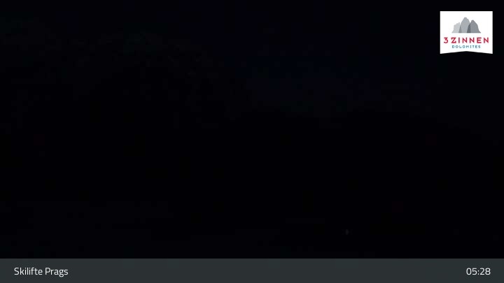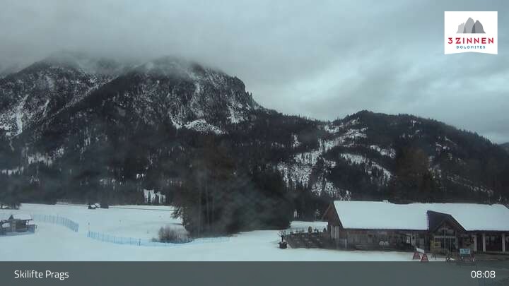 Zu sehen sind die Skilifte Prags in der Dolomitenregion Drei Zinnen. Im Hintergrund ist auch der markante Dürrenstein zu erkennen.