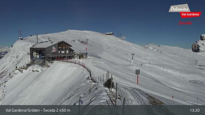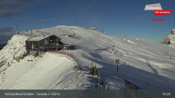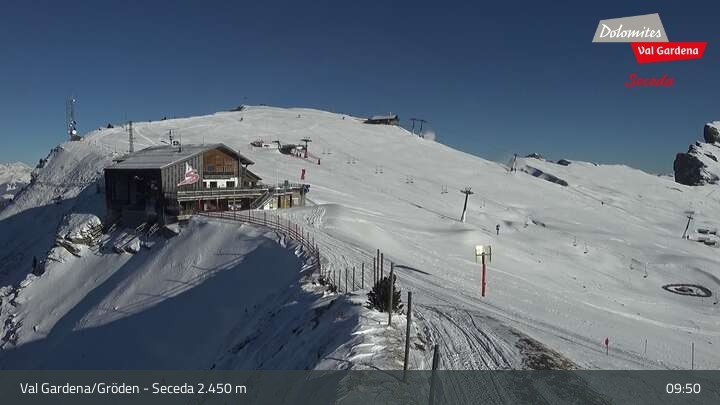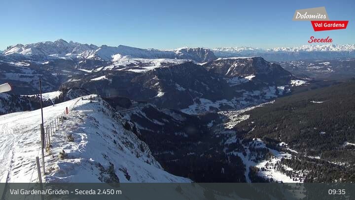 Von der Seceda eröffnet sich der Blick nach Süden zur Sellagruppe und dem Langkofel