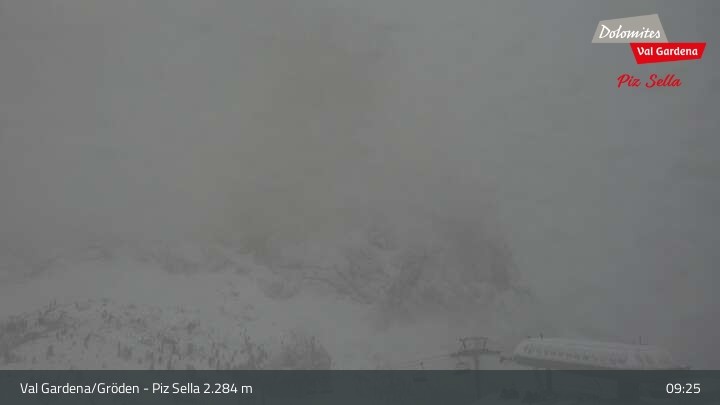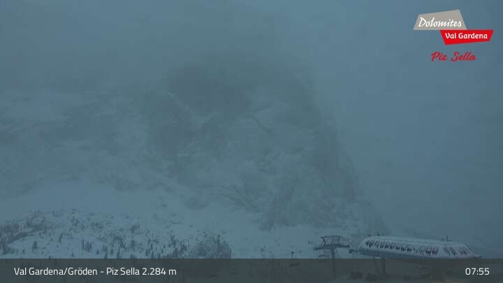 Ausblick von der Bergstation am Piz Sella in Val Gardena in Südirol. Zu sehen sind u.a. der Langkofel und die Sellagrupee.
