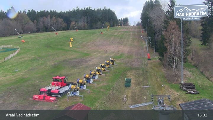 Die Webcam zeigt die Skilifte im Areal Nad nádražím bei Železná Ruda nahe der deutschen Grenze.
