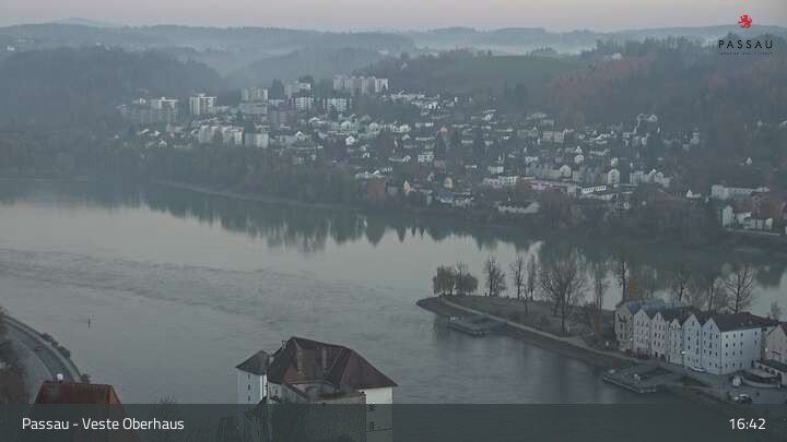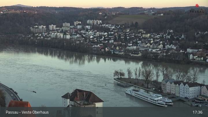Die Webcam zeigt dir den Blick von der Veste Oberhaus über die Donau zur Altstadt der niederbayerischen Stadt Passau. Sehr gut zu erkennen sind links Teile der Burgveste, die Ortspitze wo die drei Flüsse Donau, Inn und Ilz zusammenfließen, die Hängebrücke über die Donau und rechts der weiße Stephansdom.