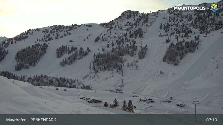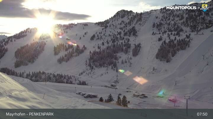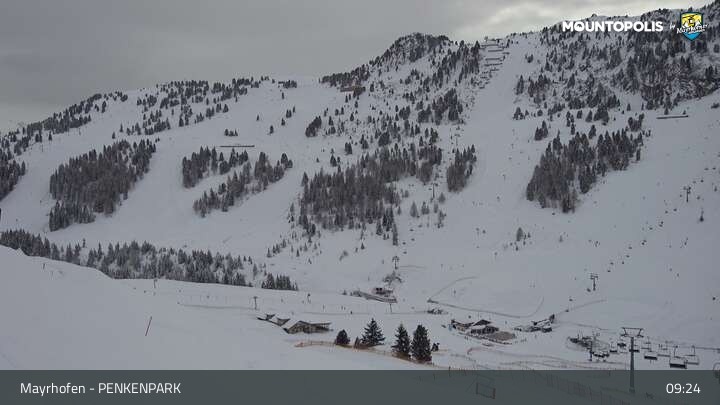 Hier blickst du auf den Vans Penken Park sowie den Sun-Jet Lift im Skigebiet Mayrhofen.
