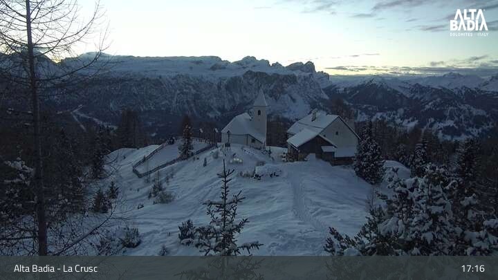 Blick von der Bergstation des La Crusc Sessellifts auf die Berge rund um Alta Badia. Die kleine Kirche ist ein beliebtes Wallfahrtsziel.