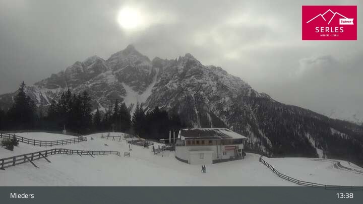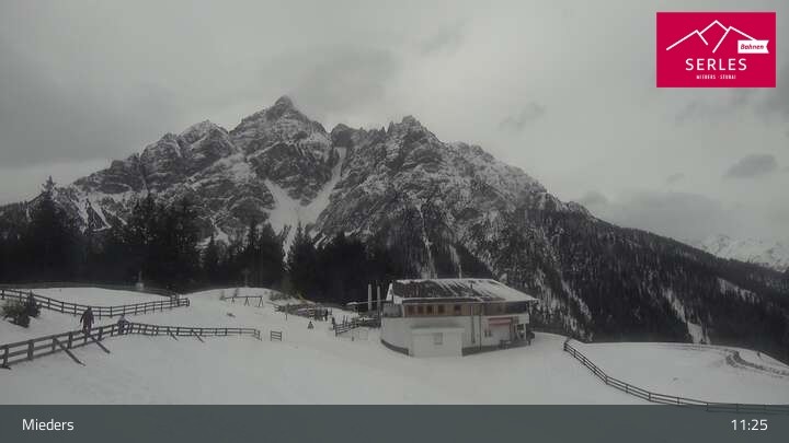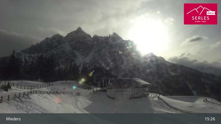 Die Webcam eröffnet den Blick von der Bergstation Koppeneck auf den Hausberg von Mieders, die Serles. Zu sehen sind außerdem das Bergrestaurant Koppeneck mit Kinderspielplatz und der Speichersee.