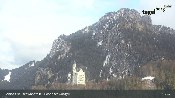 Die Kamera befindet sich am Schloss Hohenschwangau und schwenkt vom Schloss Neuschwanstein zum Museum der Bayerischen Könige.