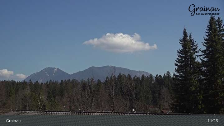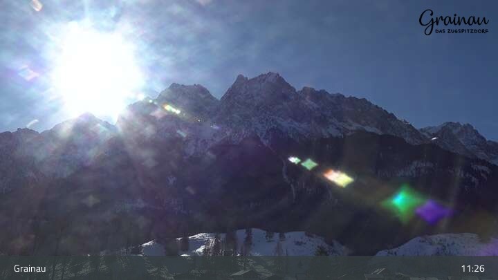 Die Live-Webcam zeigt vom Freibad aus einen Rundumblick auf das Bergdorf Grainau und seine Umgebung. Zu sehen sind unter anderem die Zugspitze, der große und kleine Waxenstein sowie der Hohe Ziegspitz.