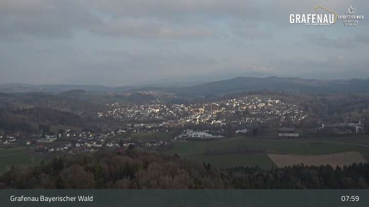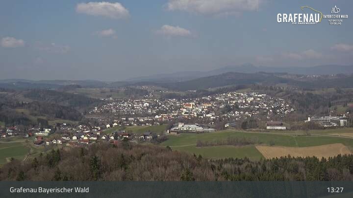 Genieße den Ausblick auf den Luftkurort Grafenau im Bayerischen Wald. Die Kamera befindet sich südlich der Stadt und blickt nach Norden über die Stadt zum Nationalpark Bayerischer Wald.