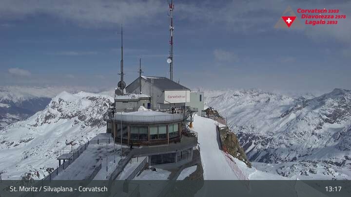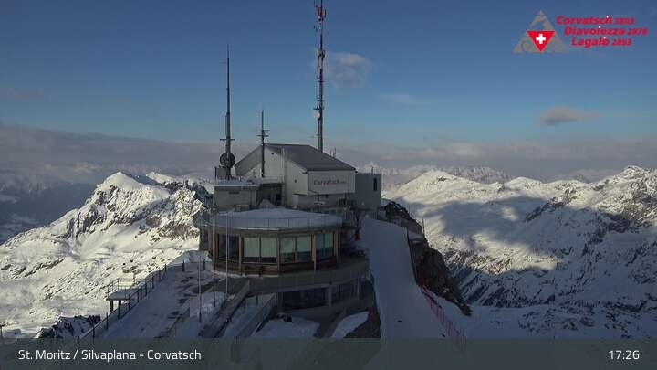Die Webcam zeigt einen tollen Panoramablick von der Bergstation der Seilbahn am Corvatsch auf den Silvaplanersee.