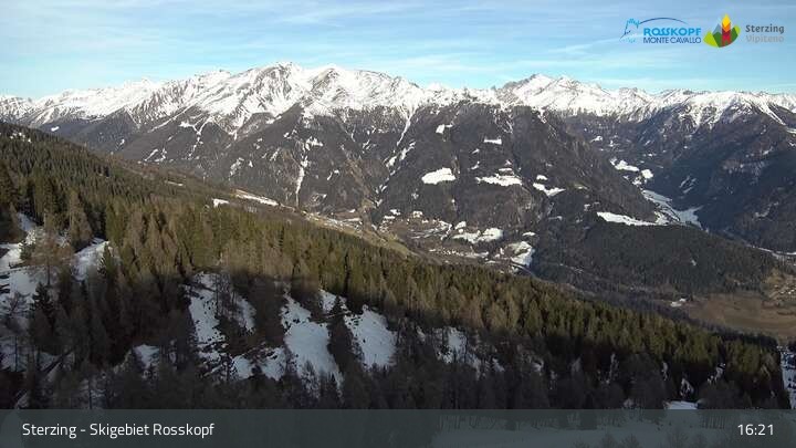 Die Kamera steht an der Bergstation der Seilbahn am Rosskopf und zeigt die Stubaier Alpen.