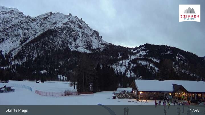 Zu sehen sind die Skilifte Prags in der Dolomitenregion Drei Zinnen. Im Hintergrund ist auch der markante Dürrenstein zu erkennen.