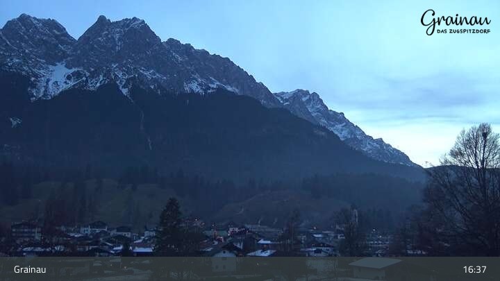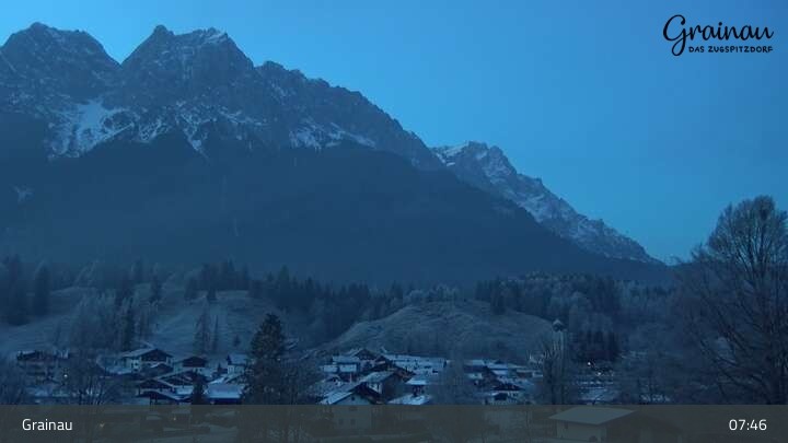 Die Live-Webcam zeigt vom Freibad aus einen Rundumblick auf das Bergdorf Grainau und seine Umgebung. Zu sehen sind unter anderem die Zugspitze, der große und kleine Waxenstein sowie der Hohe Ziegspitz.