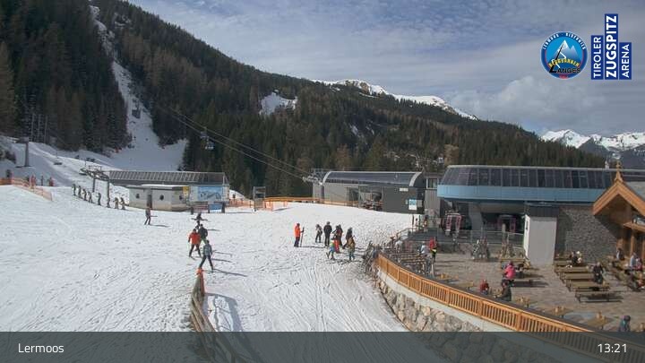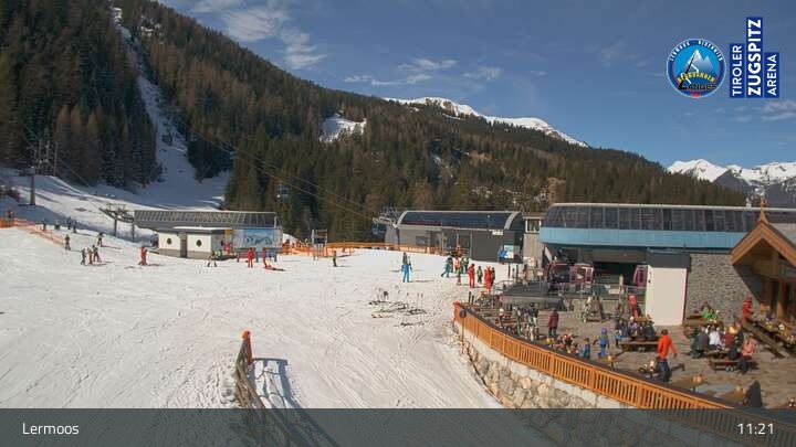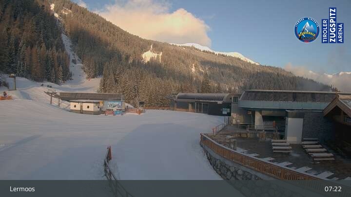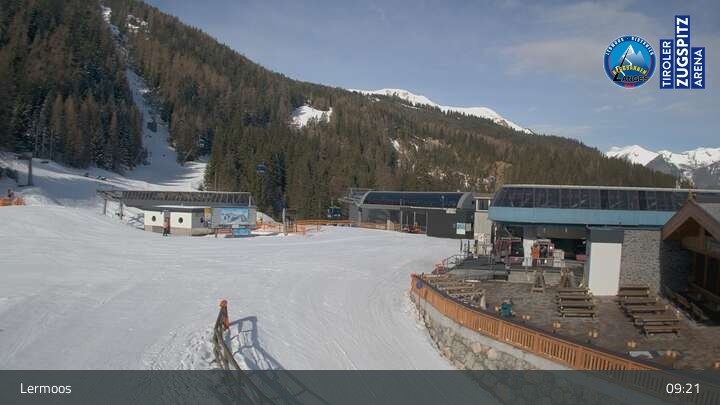 Die Webcam befindet sich an der Bergstation des Hochmoos Express in Lermoos und blickt auf die umliegenden Alpen.