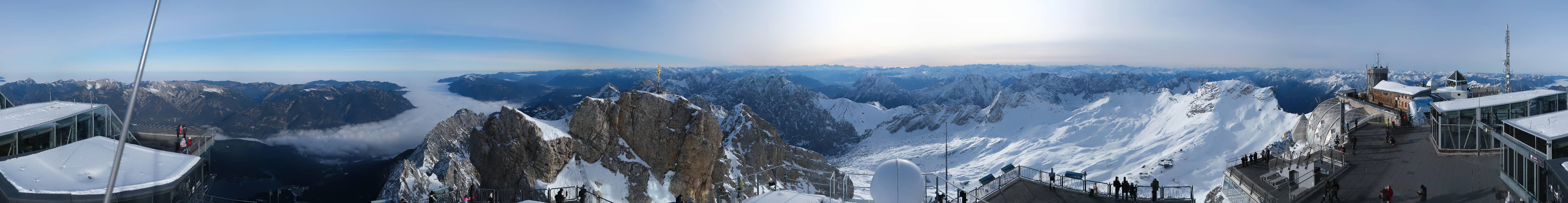 Toller Panoramablick vom Gipfel der Zugspitze, Deutschlands höchstem Berg. Zu sehen sind unter anderem die Tiroler Alpen im Süden sowie das bayerische Voralpenland im Norden.