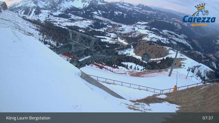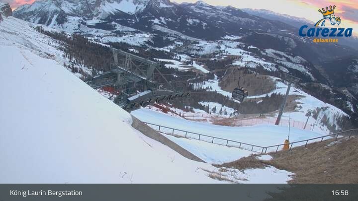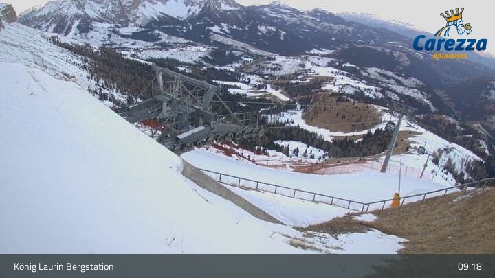 Die Webcam eröffnet von der Kölner Hütte das Panorama zum Latemar. Du siehst hier auch gut die neue König Laurin Gondelbahn mit unterirdischer Bergstation.