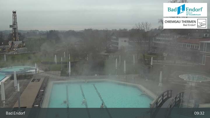 Die Webcam bietet einen Blick das Außengelände der Chiemgau Therme in Bad Endorf. Zu sehen ist unter anderem auch der 125 Meter lange Strömungskanal, ein Highlight der Therme im Landkreis Rosenheim.