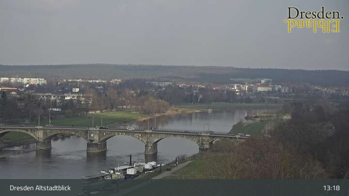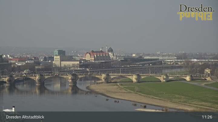 Die Kamera befindet sich am Hotel am Terrassenufer in Dresden und blickt auf die Altstadt und die Elbe.