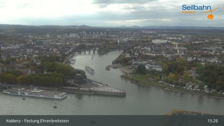 Webcam Koblenz: Blick von der Festung auf Seilbahn und Deutsches Eck, 160 m