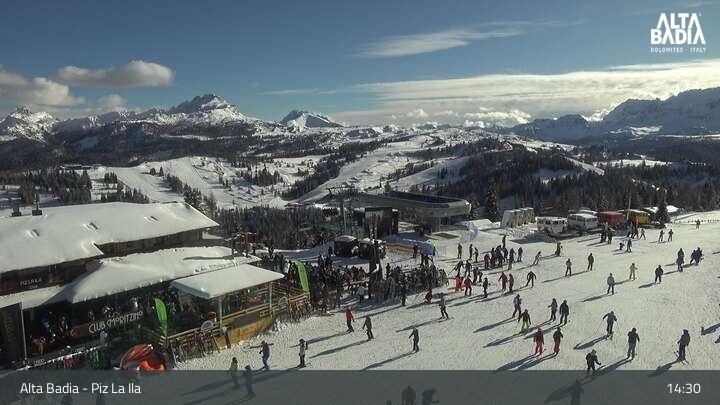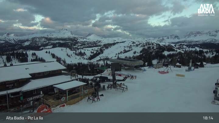 Zu sehen ist die Bergstation des Sessellifts Bamby am Piz La Ila mit Blick zum Marmolada Gletscher