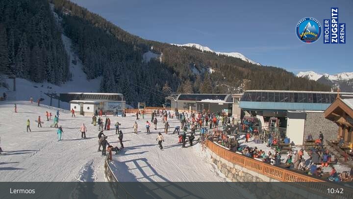 Die Webcam befindet sich an der Bergstation des Hochmoos Express in Lermoos und blickt auf die umliegenden Alpen.