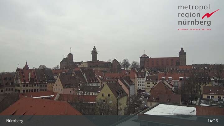 Blick über die Dächer Nürnbergs, die zweitgrößte Stadt Bayerns. Die Kamera ist in der Theresienstraße in der Altstadt positioniert und zeigt unter anderem die Kaiserburg, das Rathaus und das Staatstheater.